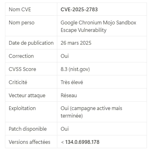 Une nouvelle vulnérabilité a vu le jour et est nommée CVE-2025–2783. Il s’agit d’une 0 day sur Chrome qui concerne tous les navigateurs basés sur Chronium. Cette vulnérabilité publiée le 26 mars 2025 a déjà été patchée par Google mais a été détectée par les équipes de Kaspersky avec :