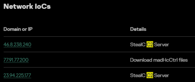 Pour cette partie, on peut lire l’article en entier pour arriver sur la partie Network IoCs, qui est la partie contenant des indicateurs réseaux. On peut lire en autre les IPs pour le StealC C2 Server !