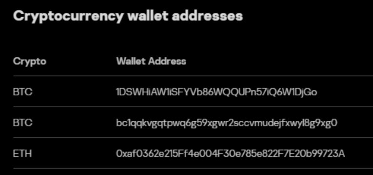 Ici, même résolution : on va voir les IOCs pour les adresses crypto qu’on trouve à la toute fin, avec des adresses Bitcoin et une adresse ETH.