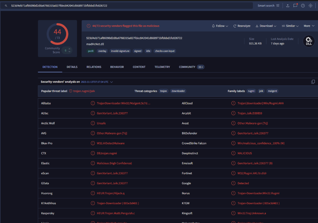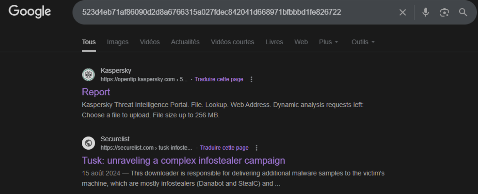 Pour ce faire, on peut regarder sur VirusTotal, mais on ne trouve rien. La meilleure piste que j’ai trouvée est de chercher le hash sur Internet, et là, bingo, on trouve un article qui en parle.