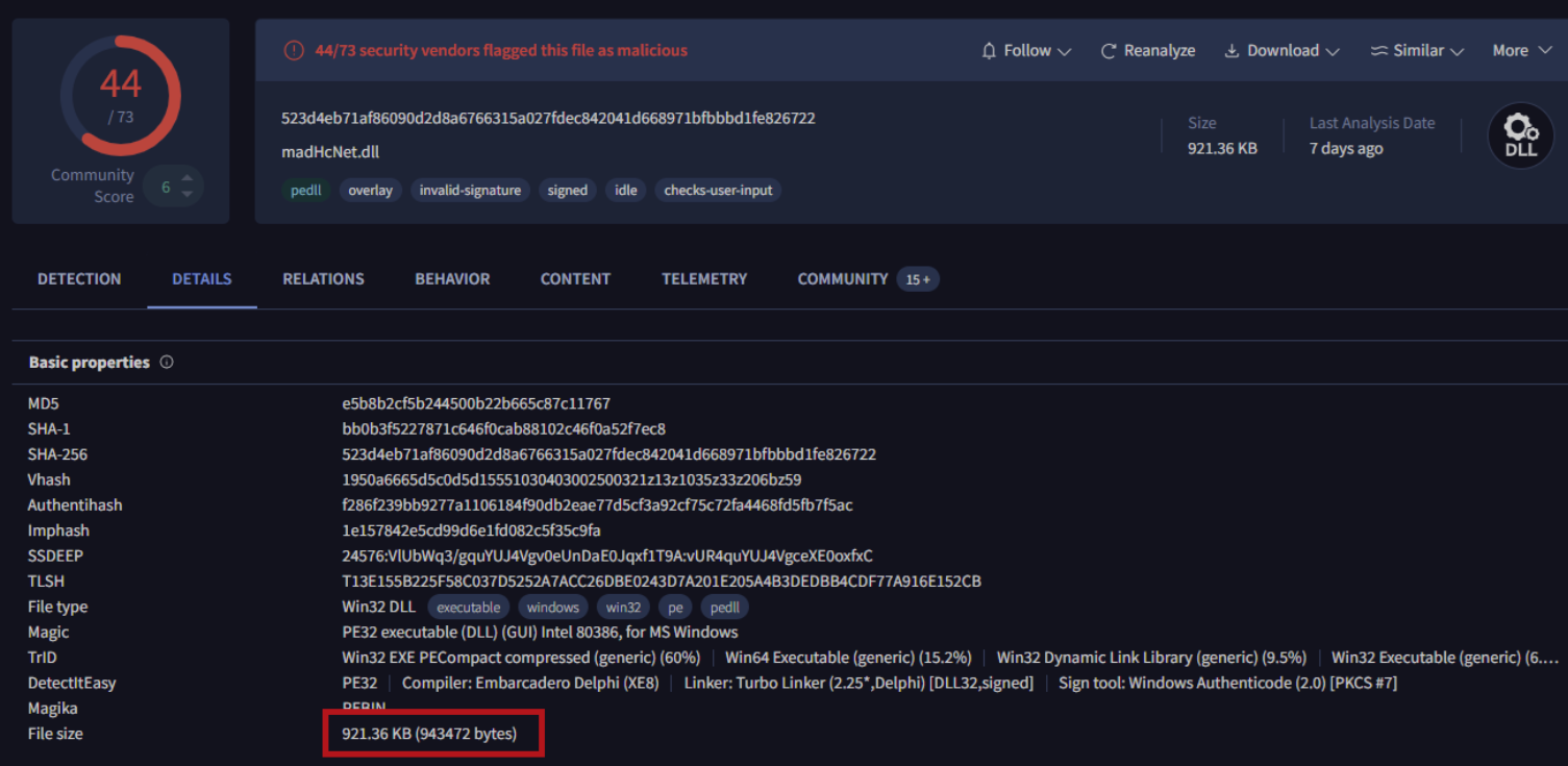 Sur VirusTotal, on peut explorer des sections, dont une appelée Details, qui donne diverses informations, dont le File Size, ce qui nous donne 921.36 KB.