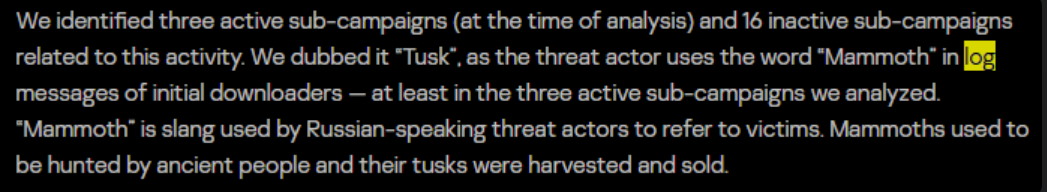 En allant voir l’article de Securelist (celui de Kaspersky étant juste un formulaire de submit), on trouve un article parlant de Tusk, une campagne d’infostealer. En regardant un peu le premier paragraphe, on trouve que le Threat Actor utilise le mot “Mammoth” dans les logs