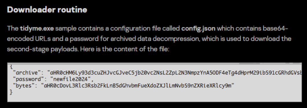 Question 5 | The malicious executable contains a configuration file that includes base64-encoded URLs and a password used for archived data decompression, enabling the download of second-stage payloads. What is the password for decompression found in this configuration file?