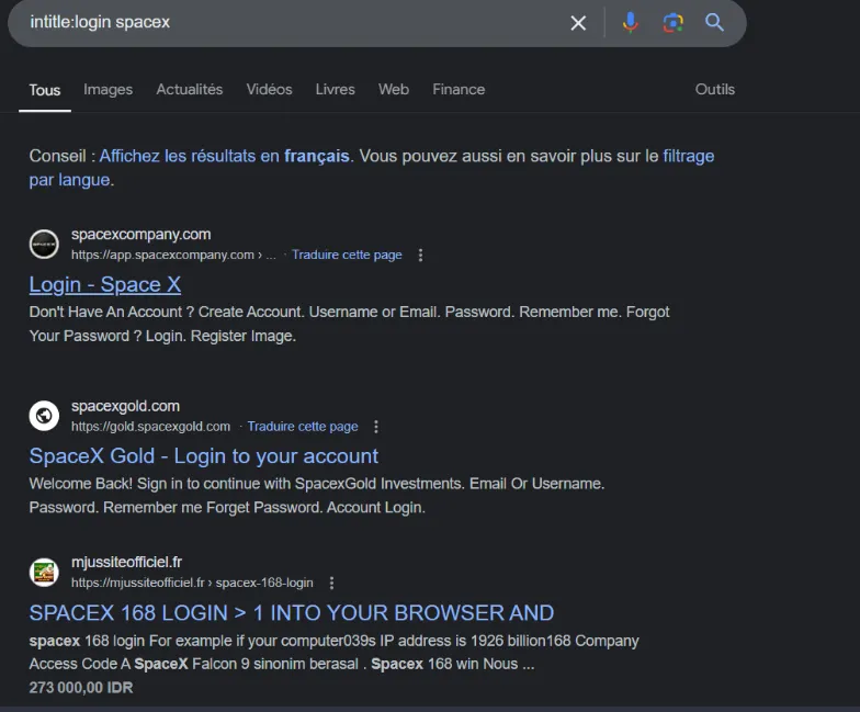 Nous allons retrouver tous les résultats présentant une interface de login ayant un lien avec spaceX comme ci-dessous :