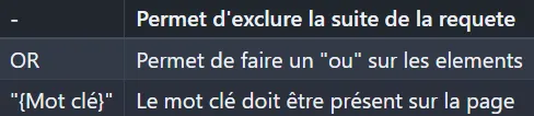 La puissance de ces requêtes est déjà acceptable, mais il est possible de les fusionner afin d’élaborer des requêtes combinant des recherches spéciales à l’aide d’opérateurs !