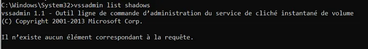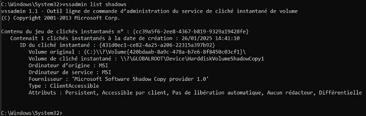 Vous pouvez consulter les shadow copy d’un système Windows en vous rendant sur le terminal et en saisissant la commande suivante :
