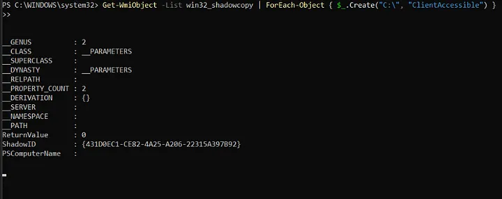Get-WmiObject -List win32_shadowcopy | ForEach-Object { $_.Create(“C:\”, “ClientAccessible”) }