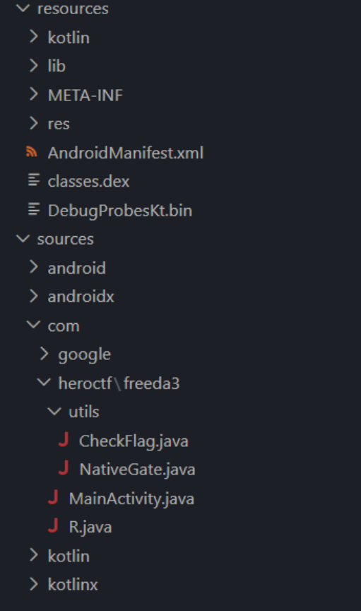 Comme on le voit, on a 2 grands répertoires resources et sources. Et dans le répertoire sources, on trouve les fichiers liés au CTF dans le répertoire HeroCTF et qui se nomment CheckFlag.java et NativeGate.java.