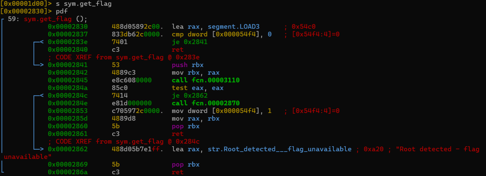 ││ 0x00002a49 803dac2a0000. cmp byte [0x000054fc], 0 ; [0x54fc:1]=0
