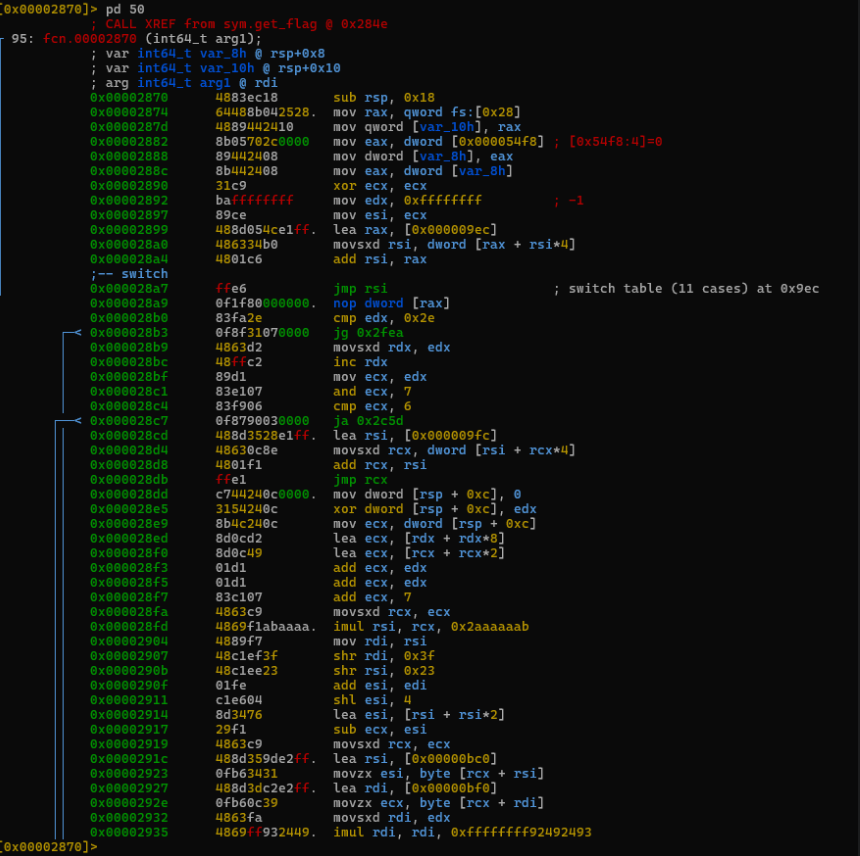 ││ 0x00002a94 486334b0 movsxd rsi, dword [rax + rsi*4]